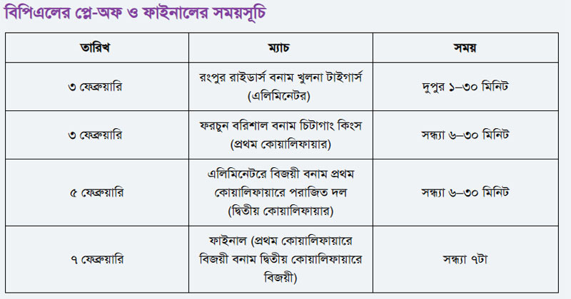 বাংলাদেশ প্রিমিয়ার লিগের (বিপিএল) একাদশ আসর ৪২ ম্যাচের লিগপর্ব শেষে চূড়ান্ত লড়াইয়ের দোরগোড়ায়। দেশের এই ফ্র্যাঞ্চাইজি টুর্নামেন্টে বর্তমানে টিকে আছে আর ৪টি দল। এক মাসের লড়াই শেষে বাকি ৪ দল ছিটকে গেছে। টেবিলের শীর্ষে থেকে প্লে-অফে উঠেছে গত আসরের চ্যাম্পিয়ন ফরচুন বরিশাল। এ ছাড়া যথাক্রমে চিটাগাং কিংস, রংপুর রাইডার্স ও খুলনা টাইগার্সের শেষ চার নিশ্চিত হয়েছে।